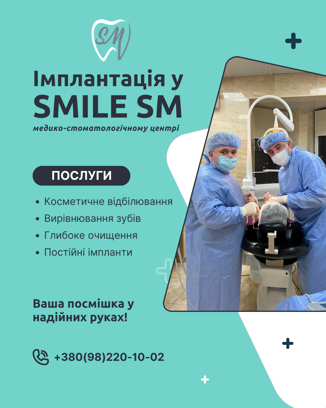 Довірте своє здоров’я професіоналам "Smile SM"!Ми знаємо, як зробити ваш візит максимально комфортним, а результати лікування - такими, що перевершать очікування.